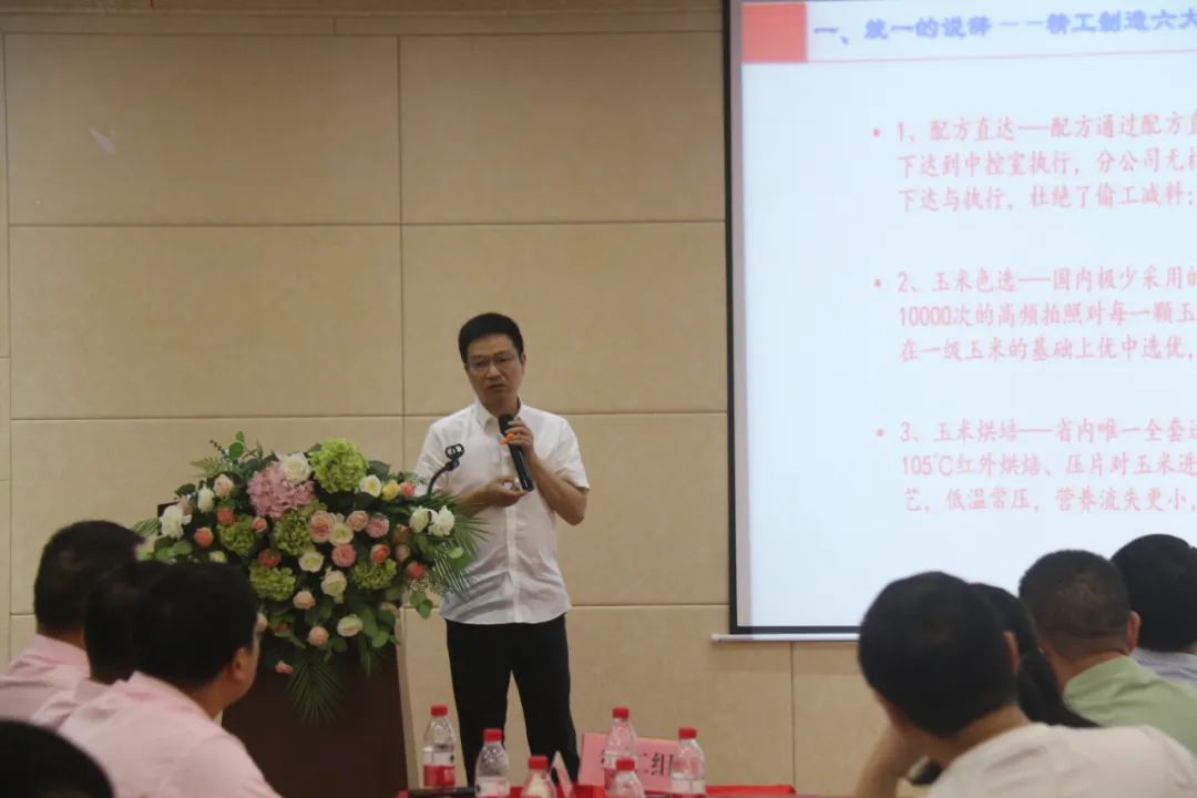 此外,集團(tuán)產(chǎn)品中心產(chǎn)品經(jīng)理李劍先生向與會(huì)者詳細(xì)介紹了九鼎斷奶料產(chǎn)品的先進(jìn)設(shè)備、產(chǎn)品工藝、質(zhì)量控制和市場(chǎng)優(yōu)勢(shì)。他的介紹讓大家對(duì)九鼎斷奶料產(chǎn)品有了更深入的了解,這不僅增強(qiáng)了大家對(duì)九鼎斷奶料產(chǎn)品的信心,也激發(fā)了大家共同努力,致力于打造中國(guó)斷奶料的第一品牌的決心。