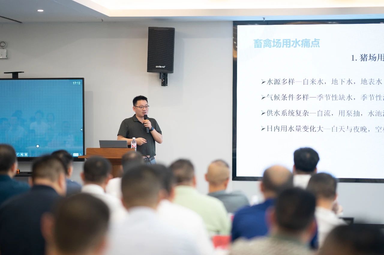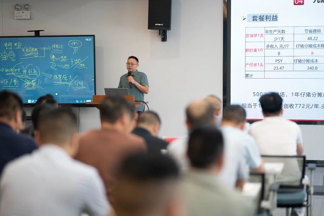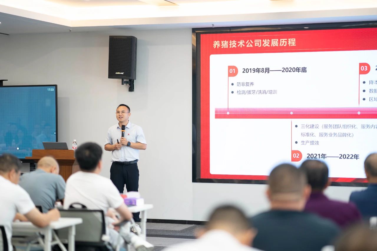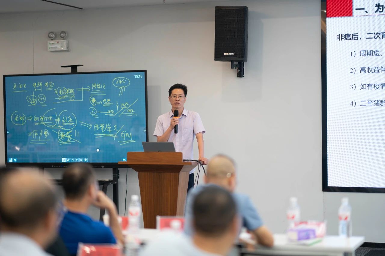▲集團研發(fā)中心總經(jīng)理江書忠介紹了《家庭農(nóng)場養(yǎng)豬E平臺》和《通過體況管理提升母豬生產(chǎn)成績》